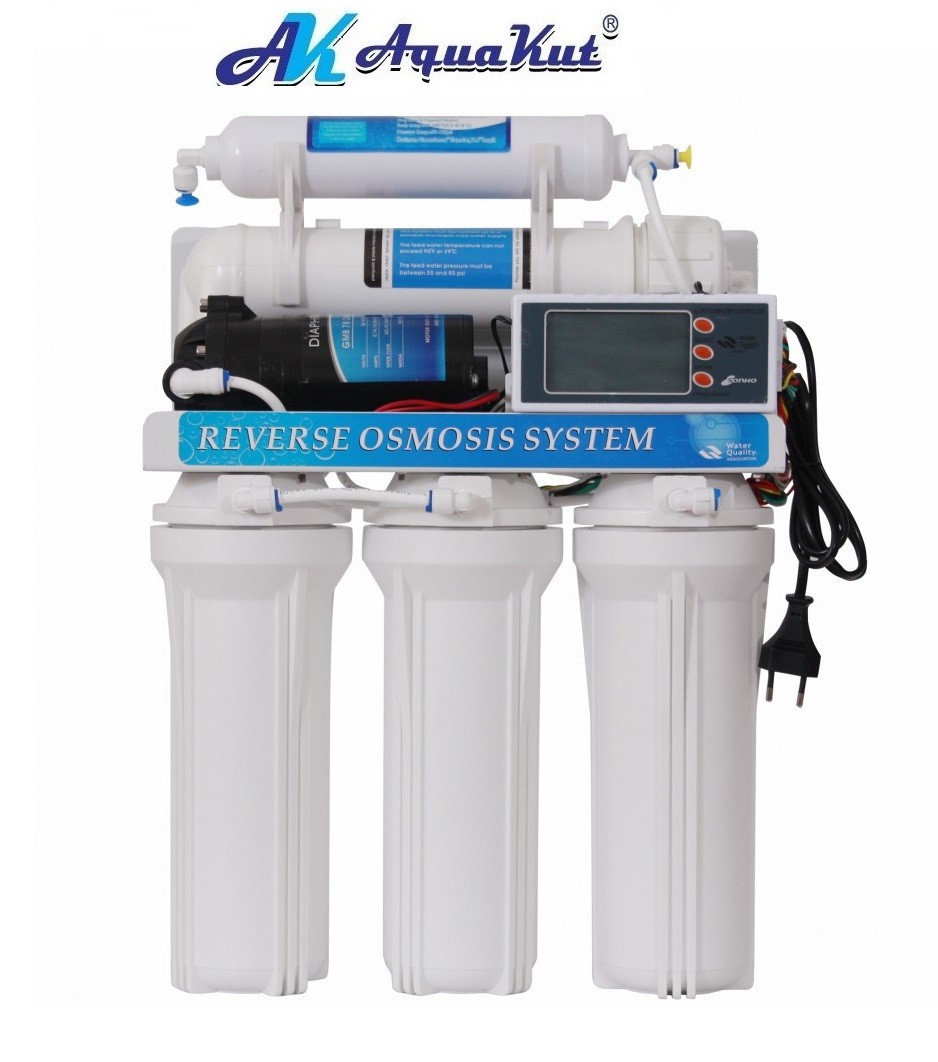 Осмос AquaKut с помпой 50G RO-6 С-01 с электронным контроллером (производительность 190 литров в сутки). Сферы применения: жилые помещения, пищевая промышленность, фармацевтика, медицина, плавательные бассейны. Соединения Quick, с соленоидом вместо четырёх ходового клапана и электромагнитным клапаном с автоматической промывкой мембраны.
