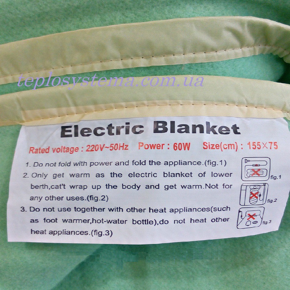 Электропростынь (другие названия: согревающая простынь, электроматрас, простынь с подогревом) ― это большая электрогрелка, которая занимает всю площадь вашей кровати. Стелиться под простынь и обогревает всю постель мягким и комфортным теплом. Есть переключатель двухрежимный (40Вт и 80Вт), который имеет световой индикатор. Включите электропростынь на второй режим (режим прогрева 45-50 градусов) за 15 минут до сна, вы прогреете всю постель и одеяло, а затем, ложась в кровать переключитесь на первый режим (режим сна 40-45 градусов). Весит 750 грамм. Наружное покрытие согревающей простыни изготовлено из стопроцентных натуральных тканей различных расцветок, с обратной стороны изделие покрыто термостойким полотном, которое удерживает тепло внутри. Тепло распределяется равномерно по всей площади электоодеяла, согревая равномерно по всей поверхности, а не отдельными участками. В режиме сна температурный режим составляет: градусов +35…+40 град. В режиме прогрева температура доходит до: +45…+55 град. Мощность, которую потребляет электроодеяло – составляет от 40 Вт до 80 Вт в зависимости от режима выбранной температуры, в денежном эквиваленте – это составляет примерно одна ― две копейки в час, соответственно десять копеек за сутки или 3 грн. за месяц, если вы будете использовать электроматрас практически каждую ночь.