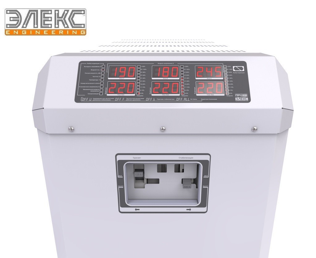 Індикатори на кожну зі фаз А, В або С, кнопка керування, світлодіод відбиття параметрів і шторка для ручного перемикання між режимами роботи. Всі контрольовані параметри зображаються на цифрових трирозрядних індикаторах, розташованих на передній панелі стабілізувального блока. Світлодіод показує тип параметра. Для перегляду всіх параметрів слугує кнопка "Вибір індикації".