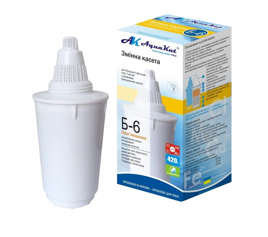 Змінний картридж Ум'якшувальний Б-6 для фільтр-глечиків Аквакут.  За кріпленням підходить до глечиків ТМ Бар'єр. У картриджах  збільшений обсяг наповнювача, що збільшує ресурс картриджа та становить 420 літрів. Картридж вирізняється вигідною вартістю й великою кількістю наповнювача.