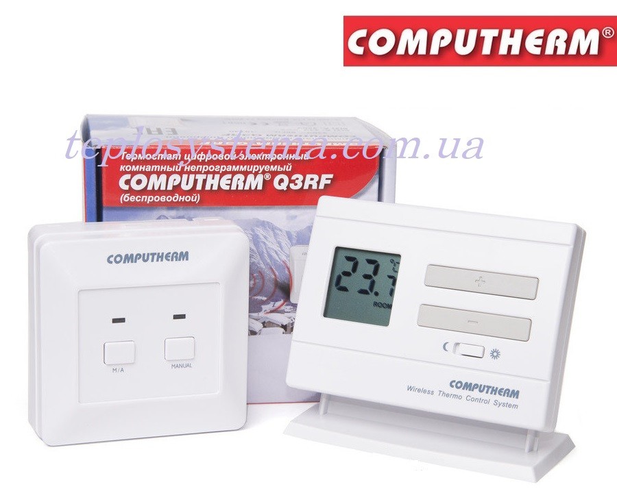 Computherm Q3 RF — це бездротовий кімнатний цифровий терморегулятор із цифровим дисплеєм, призначений для керування опалювальним обладнанням (котел, нагрівач та ін.) і для підтримки та регулювання комфортної температури повітря в приміщенні. Терморегулятор Computherm Q3 RF з цифровим дисплеєм забезпечить точніше вимірювання температури повітря в приміщенні. Встановивши на термостаті бажану температуру повітря — ви отримуєте комфортну температуру в приміщенні та чималу економію енергоносія (газ, електрика).Термостат Computherm Q3 RF, під'єднаний до котла, вимикає котел або опалювальний прилад у разі, якщо температура в приміщенні досягне заданого значення й вчасно увімкне опалення, якщо температура в приміщенні опустилася нижче заданого значення. Увімкнення і вимикання відбувається за допомогою кнопок.