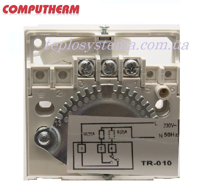 Computherm TR — 010 — це кімнатний терморегулятор із механічним керуванням, призначений для підтримання та регулювання комфортної температури повітря в приміщенні. Терморегулятор Computherm TR-010 використовується для керування опалювального котла або нагрівача (під'єднується до газового котла, електричного котла або до електричного нагрівача: інфрачервоні нагрівачі; теплові панелі; електроконвектора и др.) ― бюджетна модель механічного терморегулятора з вбудованим датчиком температури повітря для керування системою опалення. Увімкнення і вимкнення відбувається за допомогою регулювального коліщатка.