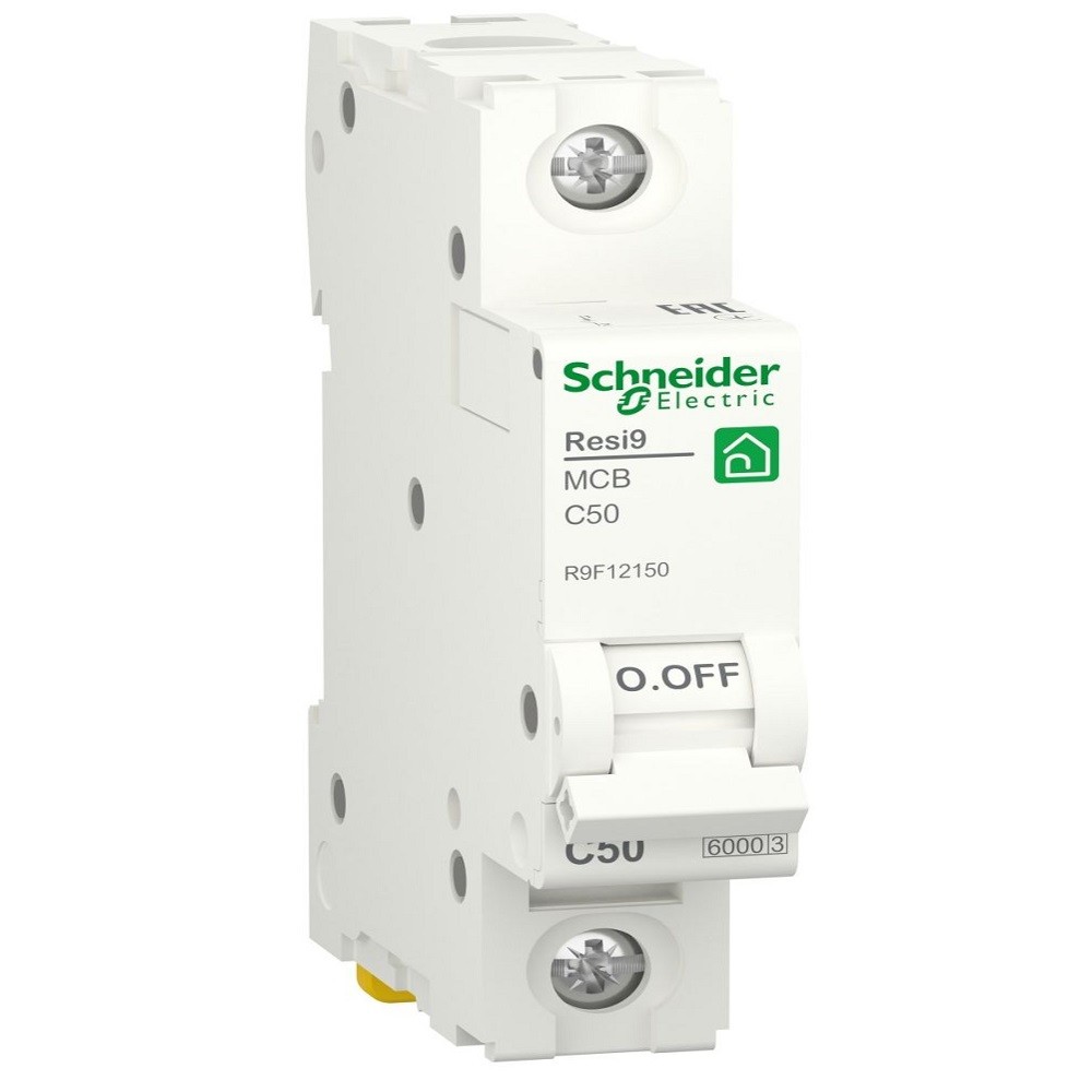 Автоматичний вимикач Resi9 6kA 1P 50A C, Schneider Electric (арт.R9F12150) - 1-полюсний вимикач з номінальним струмом 50 A та кривою відключення С. Номінальна відключаюча здатність становить до 6000 А при напрузі 230 В АС відповідно до стандарту EN/МЕК 60898-1. Цей продукт відповідає стандарту EN/МЕК 60898-1. Автоматичний вимикач захищає систему живлення від короткого замикання та перевантаження або для відключення навантаження: позиція важеля OFF означає відключення обладнання від джерела живлення. Resi9 призначений для побутового споживача і забезпечує електричну витривалість до 10000 циклів і механічну витривалість до 20000 циклів.