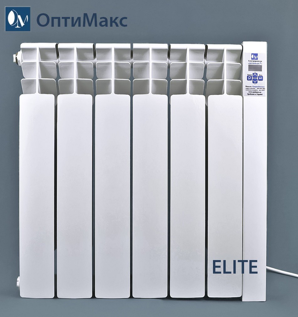 Електричний радіатор (електрородиатор) Оптимакс® ELITE  — призначений для повноцінного автономного опалення  приміщень будь-якого типу або для допоміжного опалення. Електрорадіатори Оптимакс виробляються двох типів — Elite і Standard. Відмінність між ними полягають у різній комплектації секцій.  Радіатор серії Elite має велику площу тепловіддання завдяки масивнішим реберам усередині самої секції. Так, вага однієї секції серії Elite становить 1,7 кг, а Standard — 1,2 кг. Відличити візуально секції нагрівачів серії Elite от Standard дуже просто. Радіатори  Elite мають ширину лицьової пластини будь-якої із секцій електрорадіатора 7,5 см, а тильного — 6,2 см. У Standard - відповідно 6,8 і 4 см. Тепловіддача Elite становить 202 Вт, а Standard — 160 Вт, ефективність Elite на 15-20% краща, ніж у Standard. Електрорадіатор простий у встановленні та використанні — компактний і зручний, ви легко можете перемістити нагрівач у зручне для Вас місце обігріваного приміщення — можна легко встановити на стіну або на підставку. Обладнаний програмним терморегулятором.