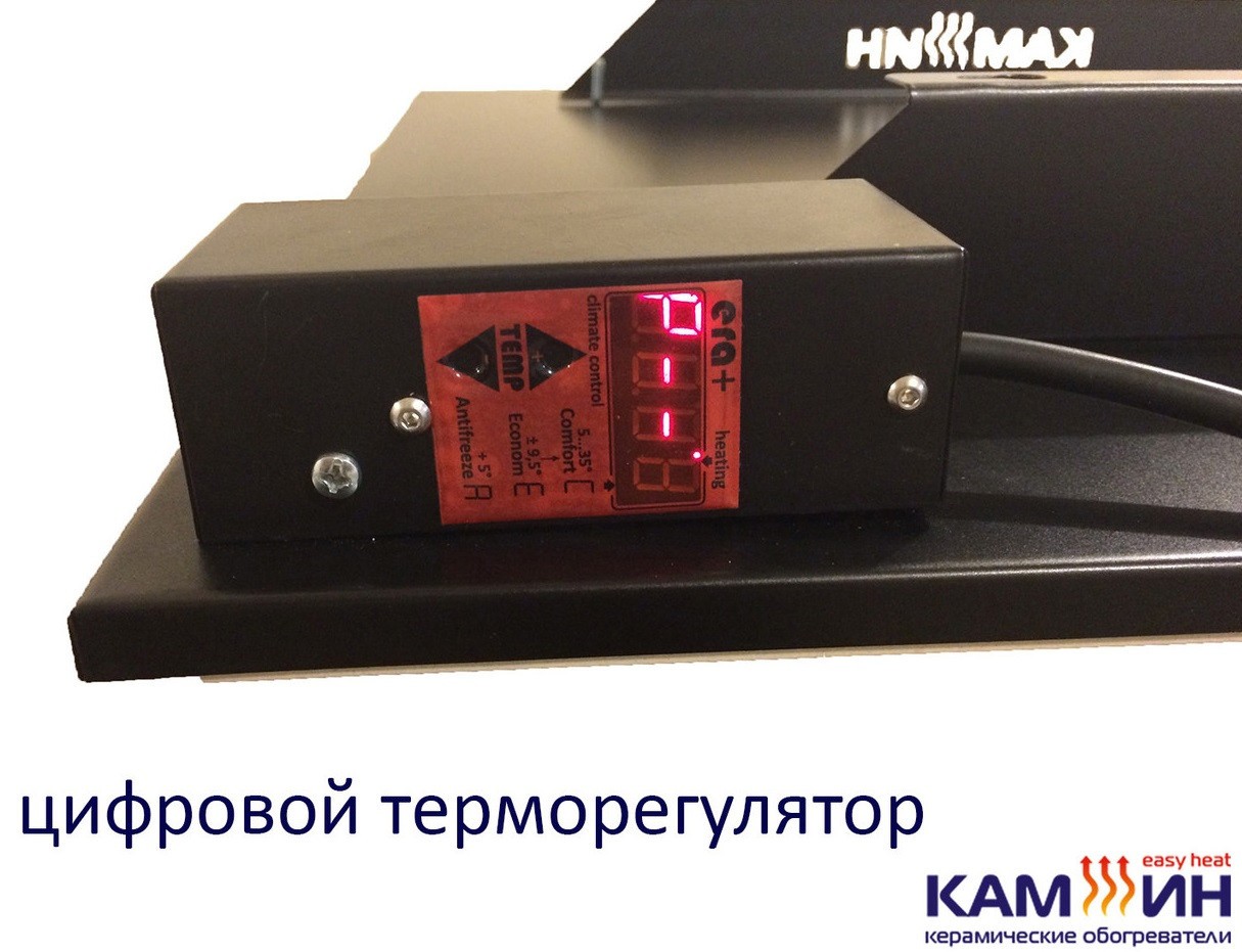 Терморегулятор простий у використанні (всього 2 кнопки: підняти/опустити темп в кімнаті ) і видає інформацію (температура ,поточний режим обігріву,годинники тощо). Відсутність гістерезису (панель знаходить потрібну температуру поверхні в залежності від тепловтрат приміщення). Контроль температури поверхні панелі - захист від перегріву. Терморегулятор здійснює автоматичний контроль температури повітря в опалювальному приміщенні.