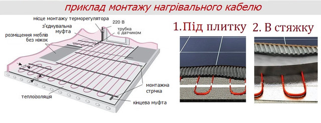 Спосіб з'єднання нагрівальної жили і живильного проводу: водонепроникна муфта;
